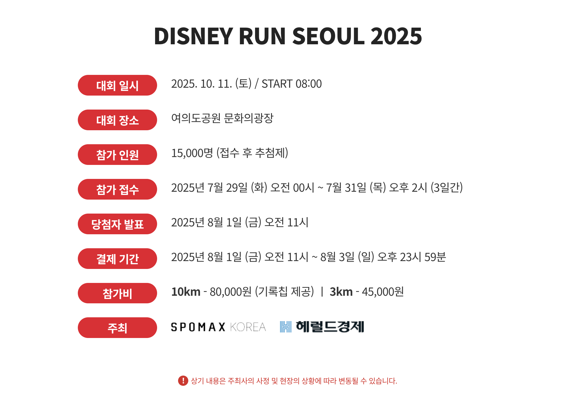 ※ 본 포스팅은 2025년 7월 말 현재 공개된 공식 정보를 기반으로 작성되었으며, 이후 행사 취소·수정 등의 변동 사항은 반드시 디즈니런 공식 홈페이지에서 최신 정보를 확인하시기 바랍니다.