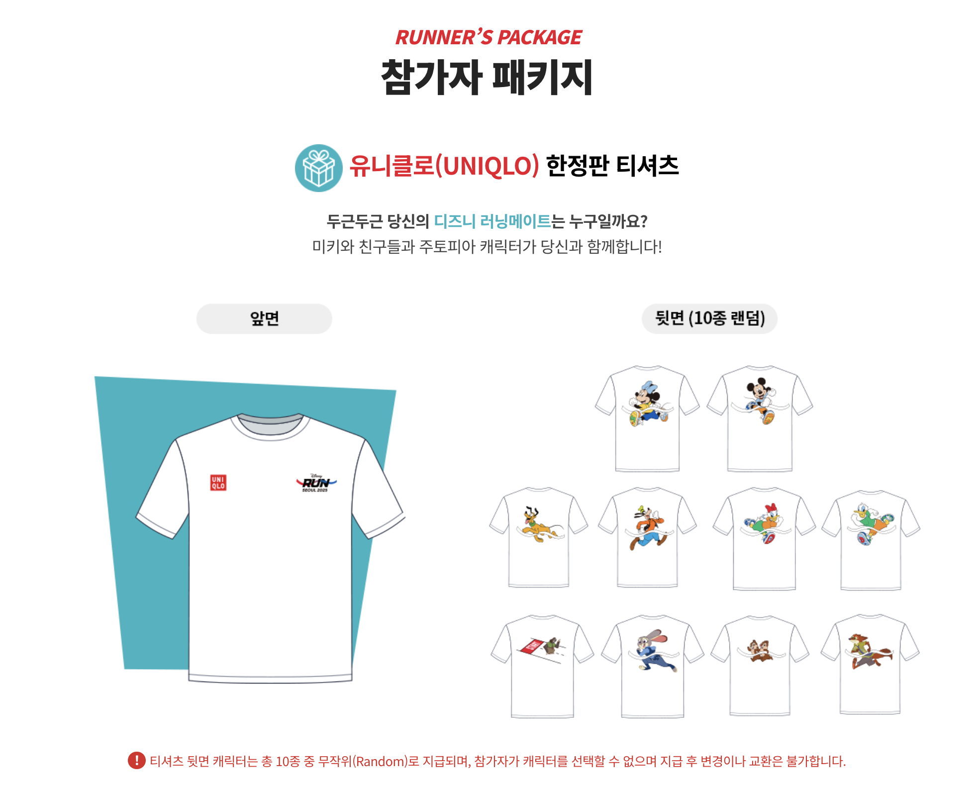 - 한정판 유니클로 협업 티셔츠: 미키·미니 또는 닉·주디 디자인으로 랜덤 제공. 티셔츠 사이즈 선택은 신청 시만 가능